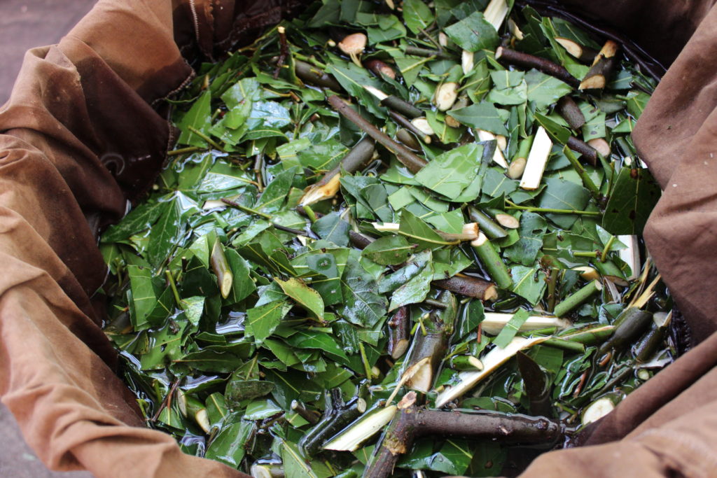 月桂樹の枝葉を細かく刻み、煮出していきます。葉や枝を細かく刻むほど色素が出やすいのでみんなで協力してできるだけ細かく刻みました。