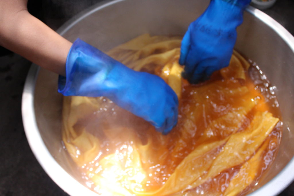 また2日目の麻を染めるための準備として下地処理の作業をしておきます。この作業は、1時間もかかり1㎏以上の布をお湯の中でまんべんなく回し続ける単純で大変な作業なのですが、綿や麻をきれいに染めるために欠かせない重要な工程なのです。
