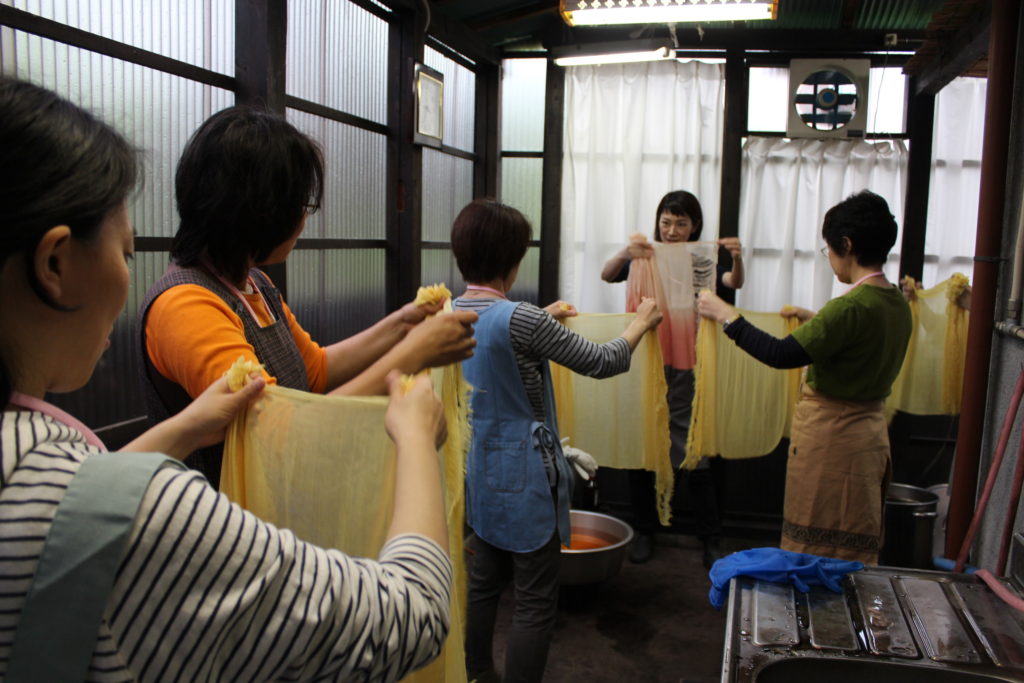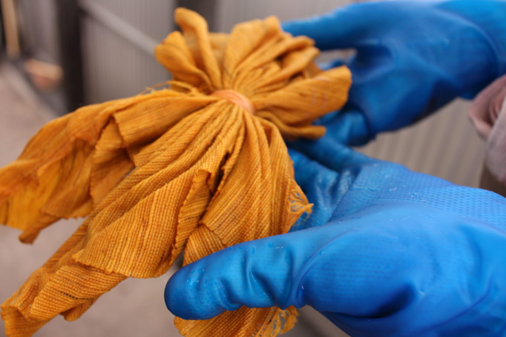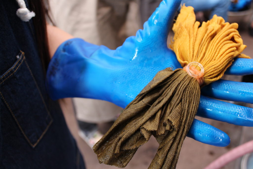 1日目は、玉ネギの薄皮を使って染液を作りました。大判シルクストールのきれいなぼかし染の方法を練習し染めたのですが、ひだを寄せる指の使い方がかなり難しかったようです。