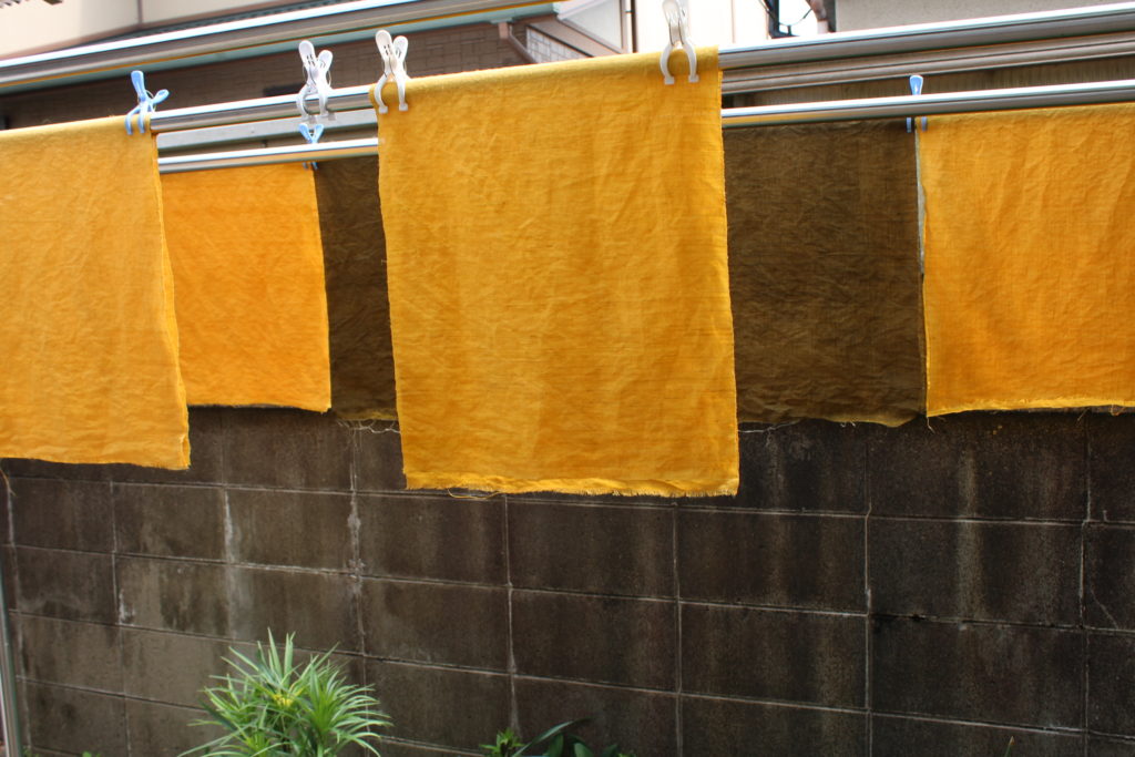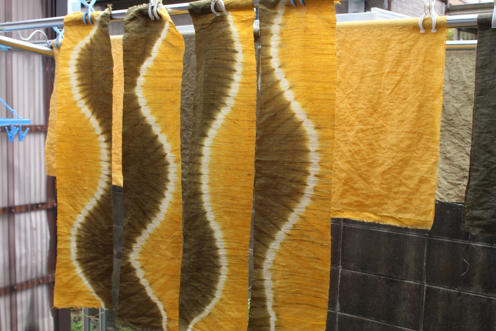2日間でシルク大判ストール1枚、座布団用の麻生地として使う麻生平(あさきびら)2m、麻ランナー1枚を染めます。
