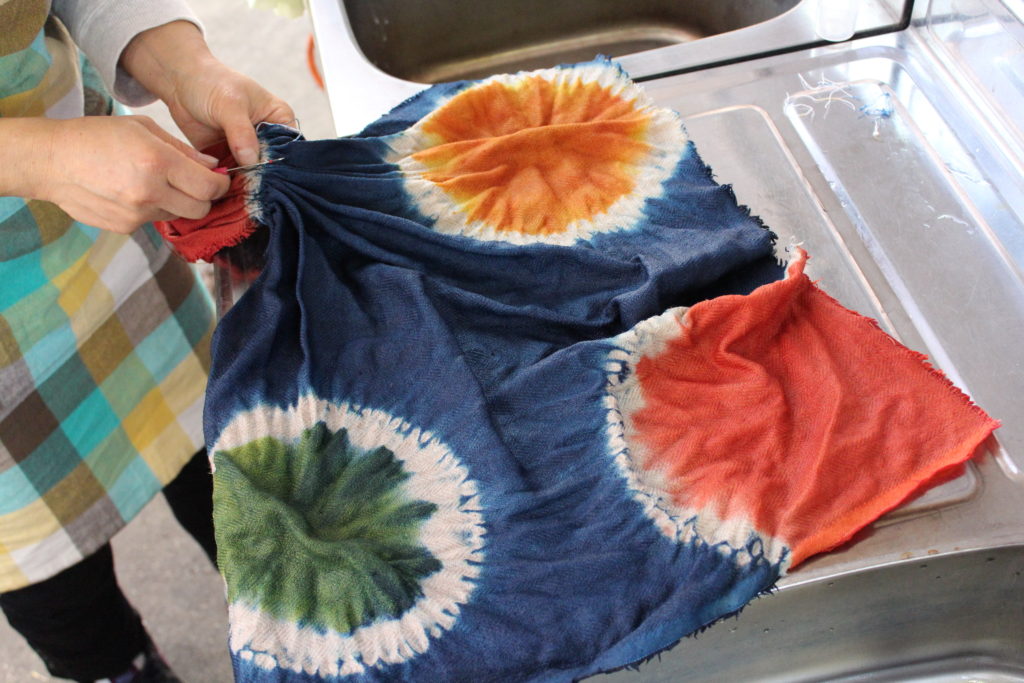 染める植物は、びわ、茜、藍、栗、キバナコスモス、ログウッドなど。今年は何故か藍染をする人が多かったです。その他、栗や茜などを使ってデザインに合わせて地色を染め分けたり、濃淡だけではなく何色もの色を絞り染めで染めた人もいました。