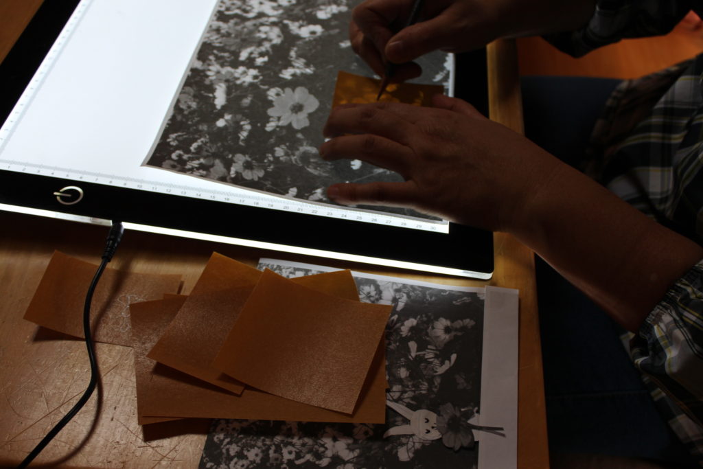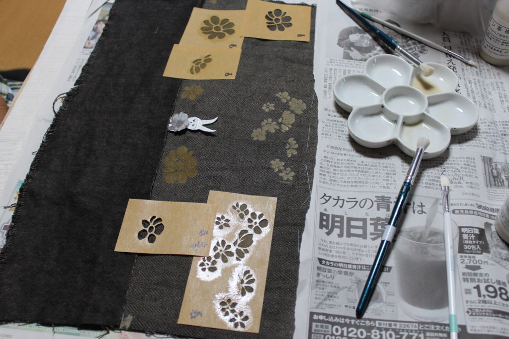 Iさんは、花いっぱいの野原を表現されました。お花畑の写真から型紙を写され、お花1つ1つを丁寧に型で彫って着抜しています。