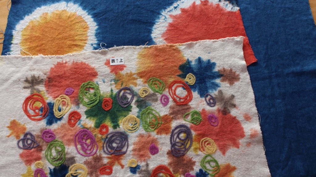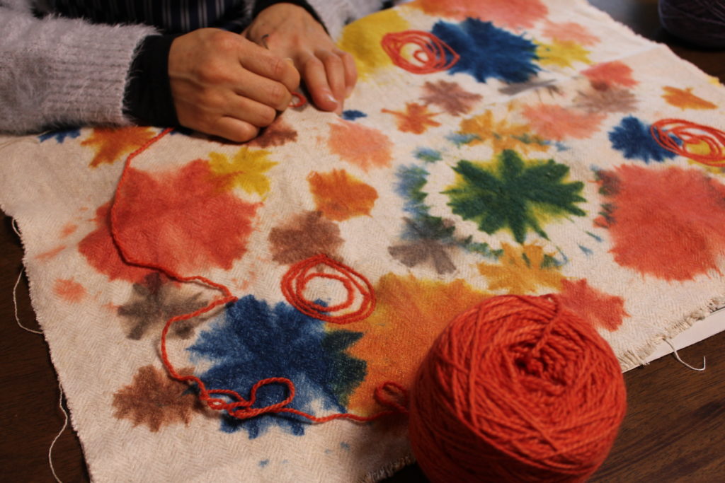 ここにも、ここにももっと色を入れたいと様々な糸でフェルティングされました。先に染めた地色と響き合ってはじけるような元気で可愛い作品となり、ほかの受講生からも「このまま飾ってもきれい」と評価されていました。草木染=渋くて暗い色という概念を吹き飛ばしますね~!