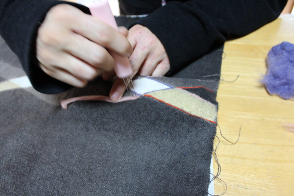 授業で染めた茜やログウッドなどの糸を使ってフェルティングをしていきます。この時のサクサクする音がリズミカルに教室に広がっていました。