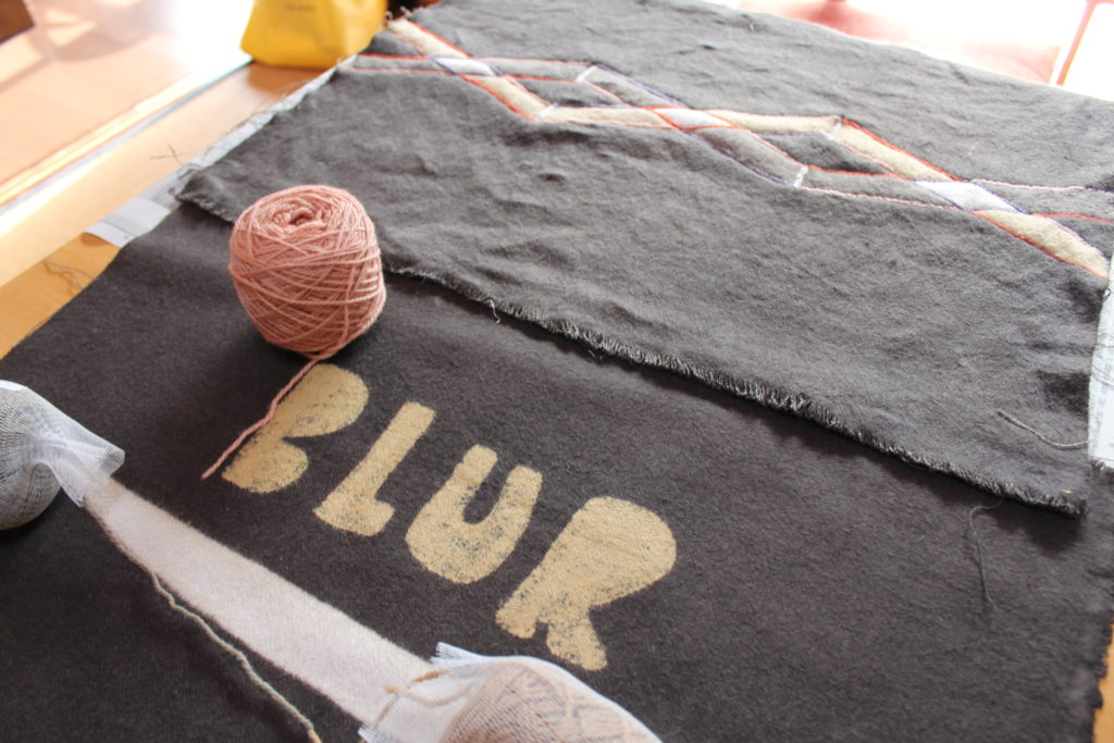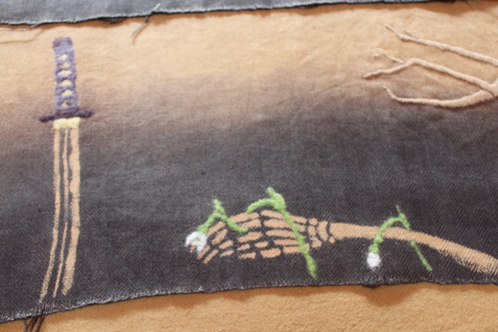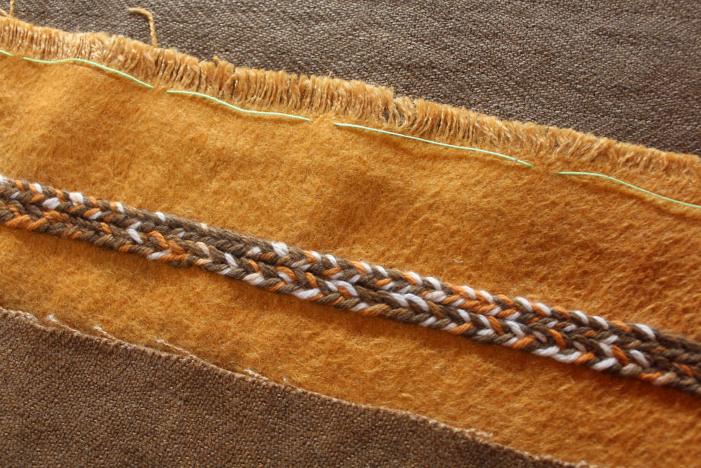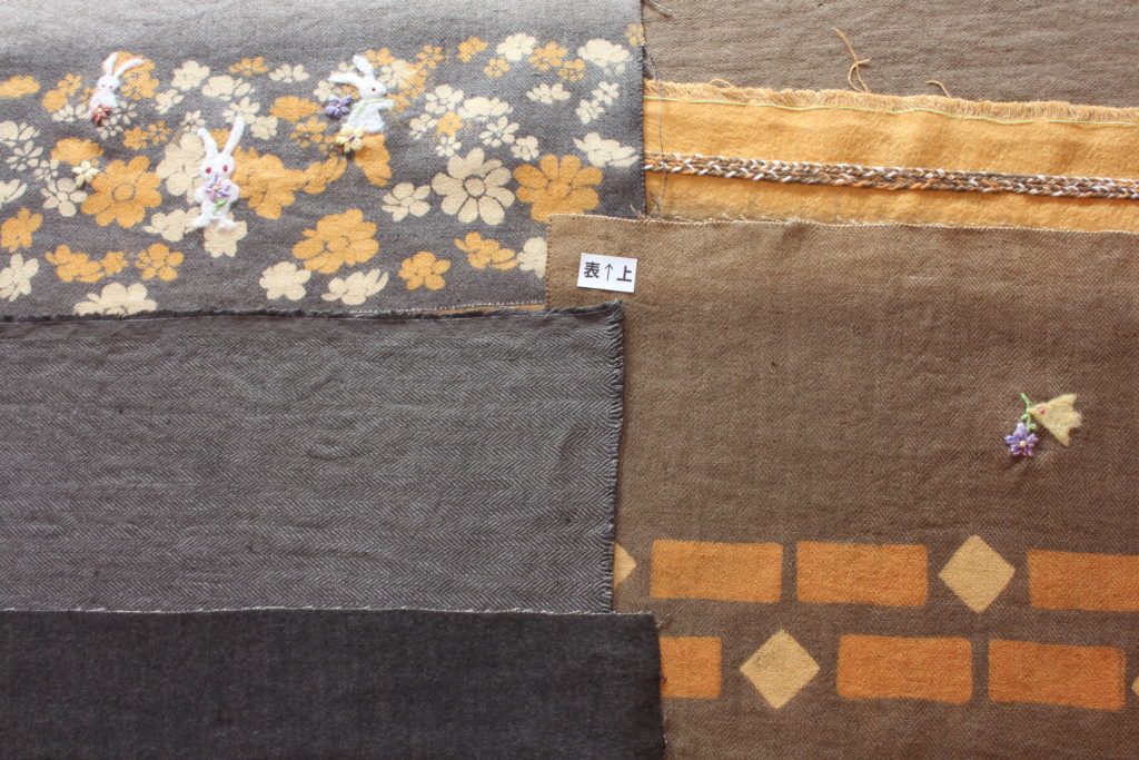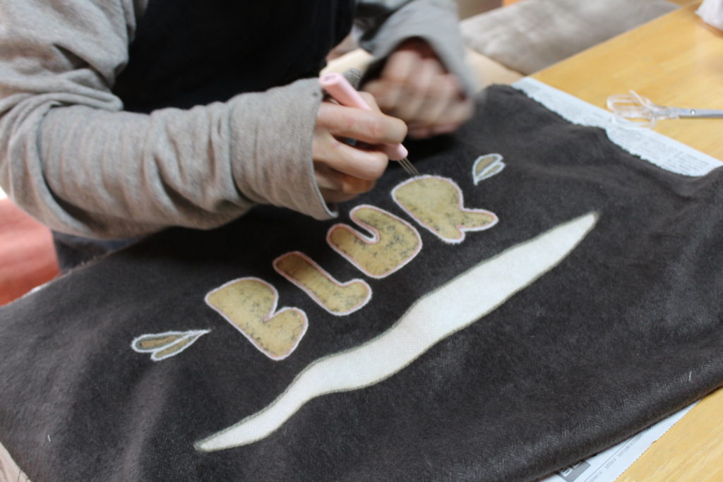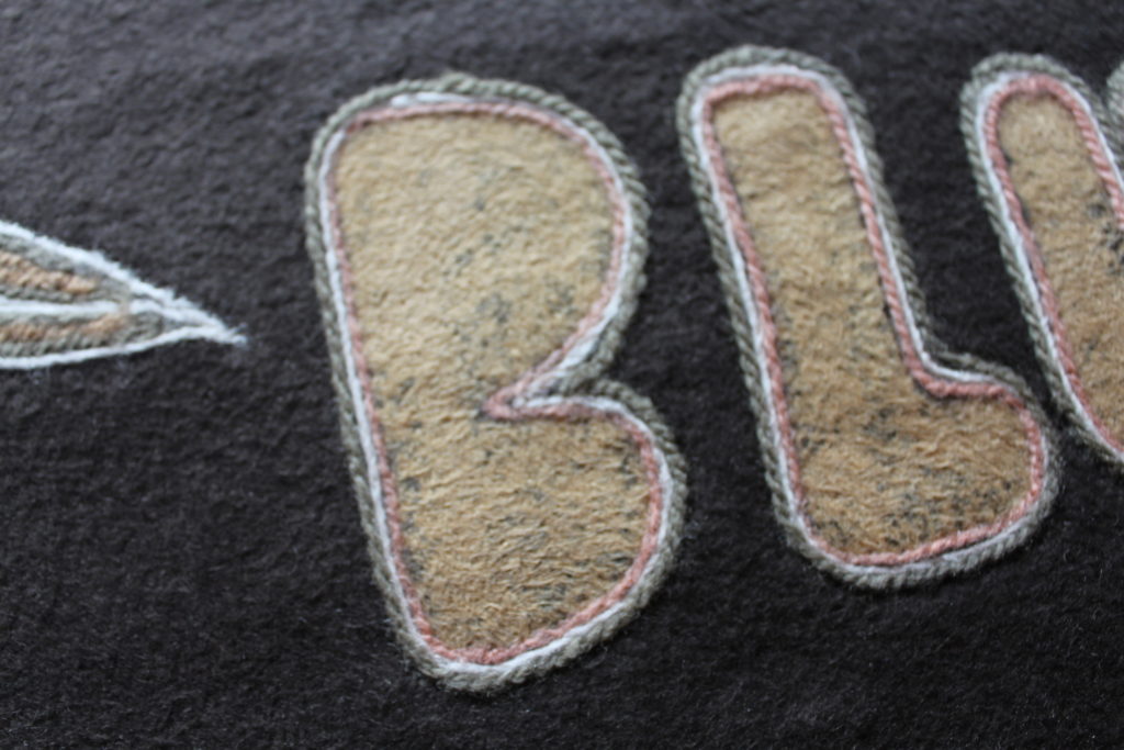 ひし形部分にビワやあかね、ログウッドなどの原毛を使って丁寧に線をフェルティングで描いています。文字部分は、毛糸と原毛で縁取りされました。起毛面の表情、面白いですね。