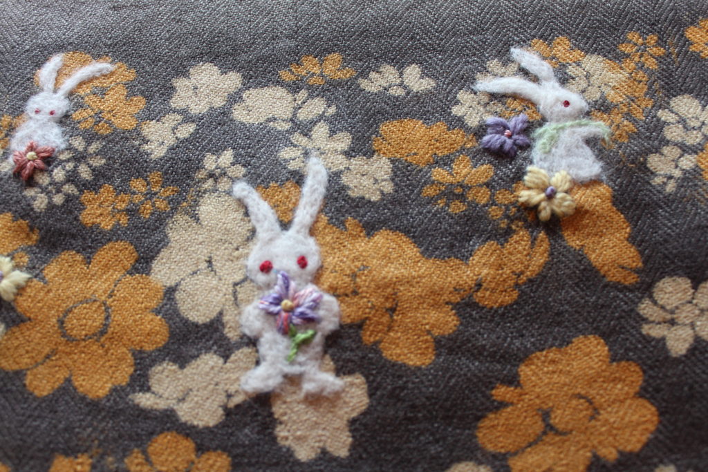 お花畑の中のウサギさんは、白の原毛でフェルティング。お花は草木で染めた糸で刺繍をしています。Iさんが抱く可愛らしいイメージが丁寧に良く表現されています。