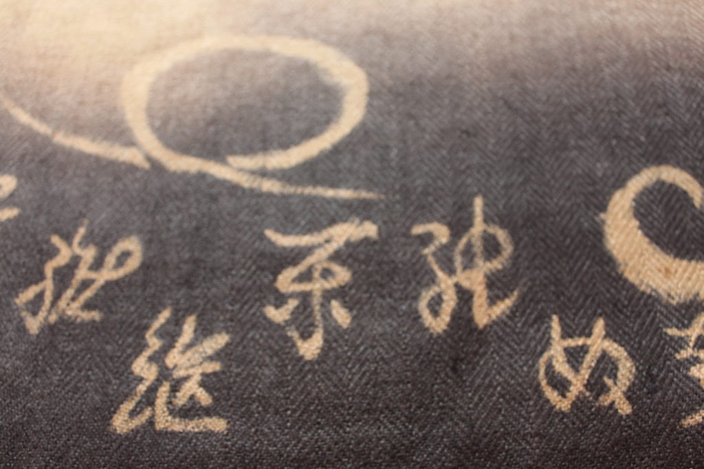ひし形にクロスした部分は板締め絞りで、ローマ字は栗で黒く染めた部分を着抜技法でかすれたように表現しています。