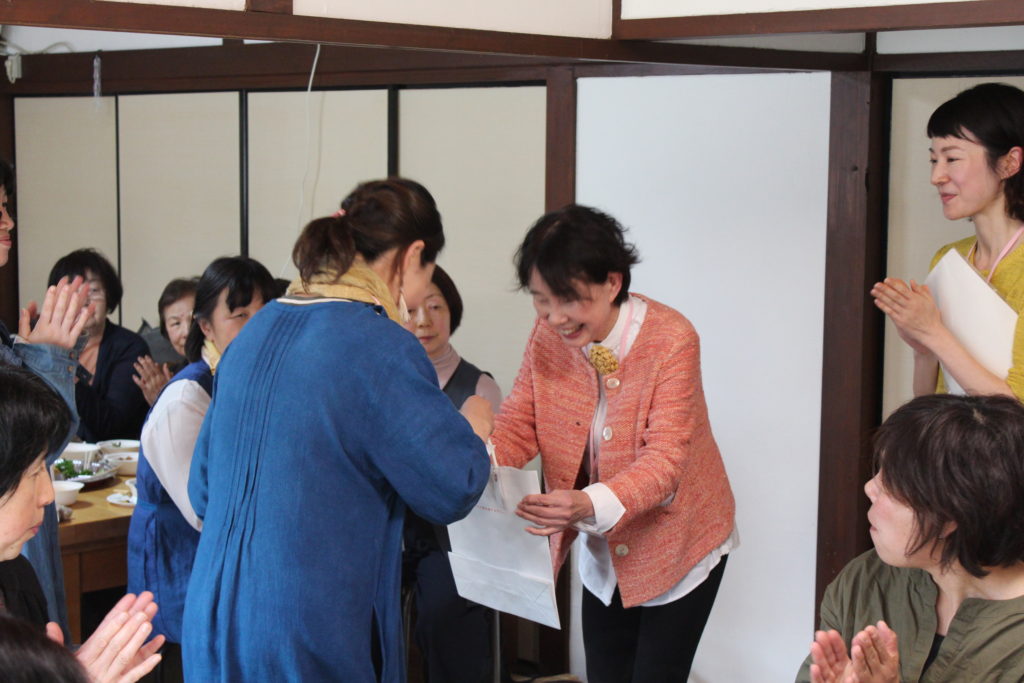 修了式はフリースタイル講座のみなさんに見守られるなか、修了証書授与を行い、インストラクターの資格を取った方々には今後の活動に使う名刺や看板、アカデミーのエプロンなどの贈呈も行いました。