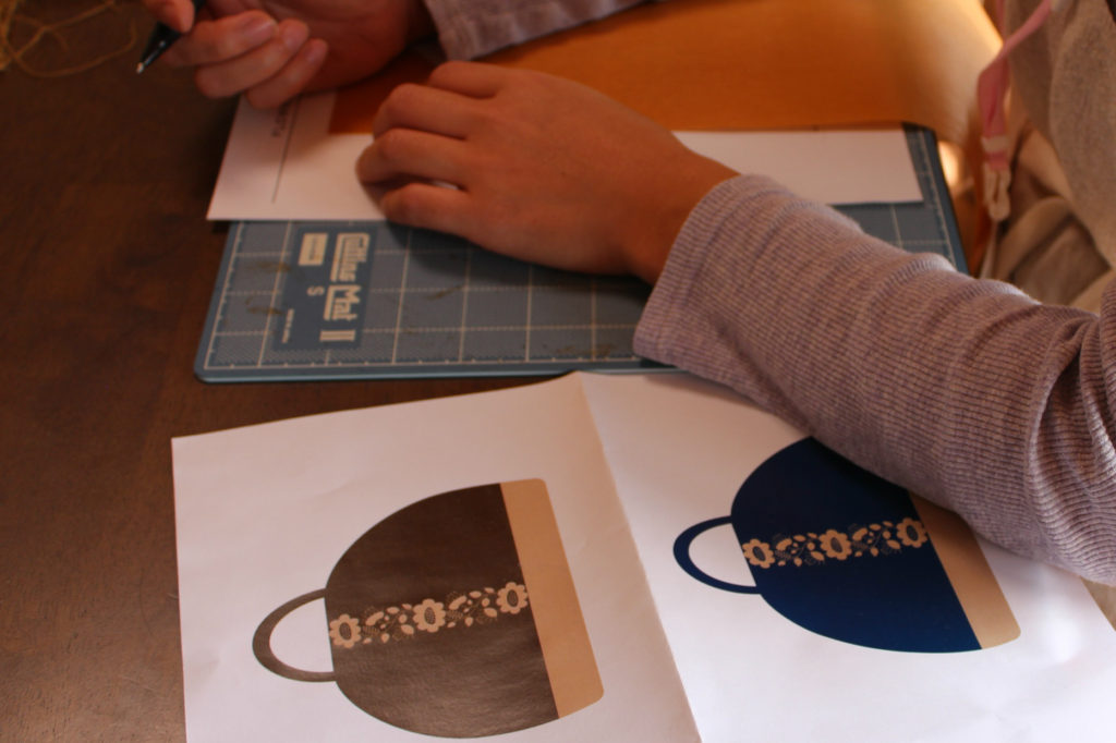 もう一つの面は、小鳥と木の抽象的な模様を着抜技法で表現しています。