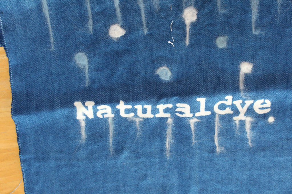 裏面は、ローマ字を型紙を切って白く文字が抜けるように藍抜染をし、原毛で流れるようなフェルティングをしています。