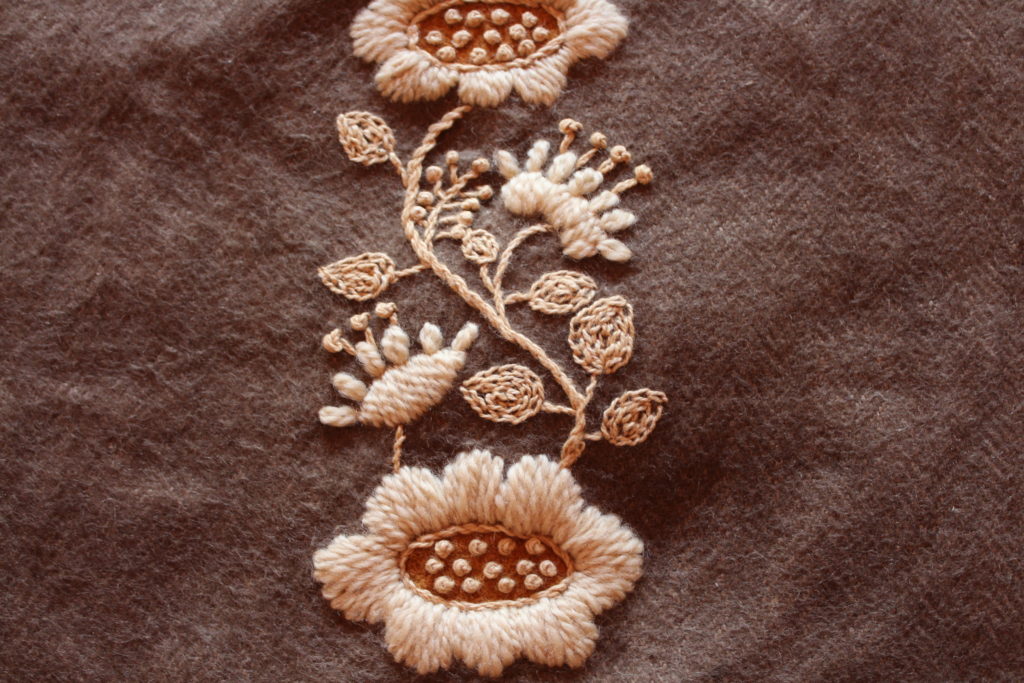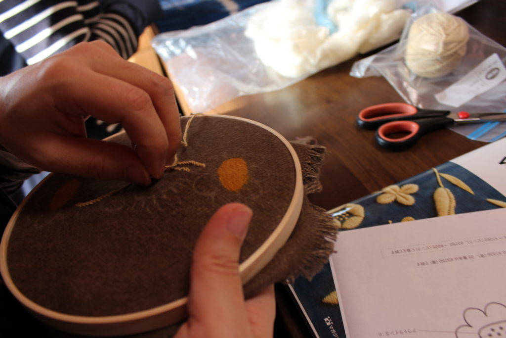 栗の染液で鉄媒染をして地色を染め、お花の中心部分をチタン着抜しています。その後は、草木染した毛糸を使って刺繍をしていきます。