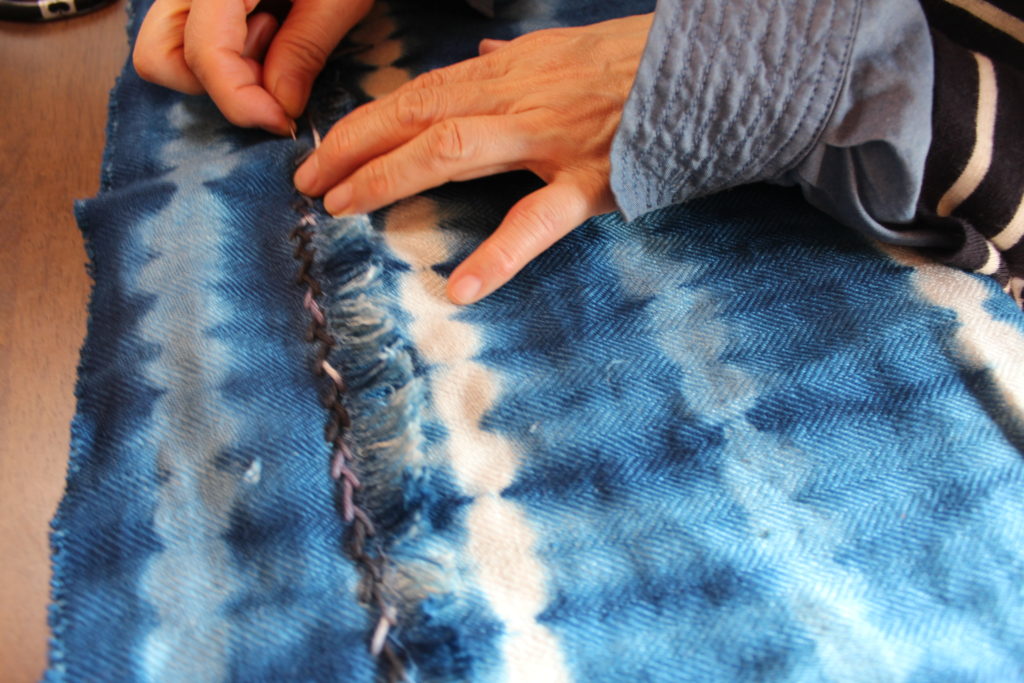 藍染で濃淡をつけて染めた後、布の端をほどきフリンジを作りました。ログウッドでぼかし染めした綿糸を使ってステッチで布をつなぎました。フリンジで切り替えをしているのがおしゃれなアクセントになっています。