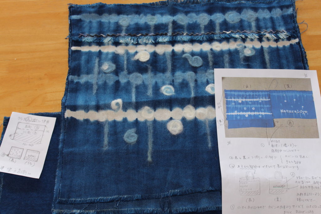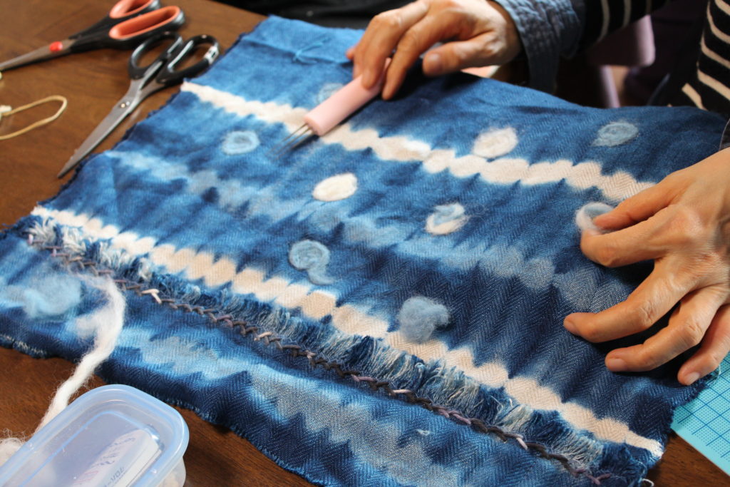 つないだ布に、藍染した原毛を使って可愛くフェルティング。