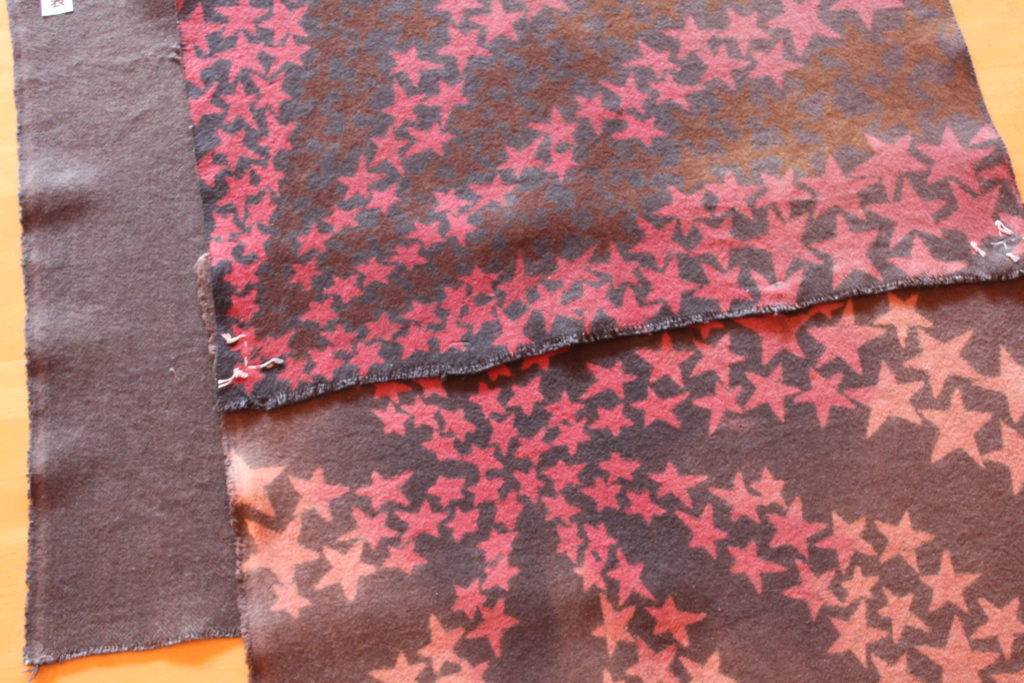 次はHさんの作品です。織の学校にも通っておられるHさんは、起毛した面に細長い板と小さな四角の板を使って板締め技法で、栗のミョウバン媒染と鉄媒染で重なり合った模様を染めています。
