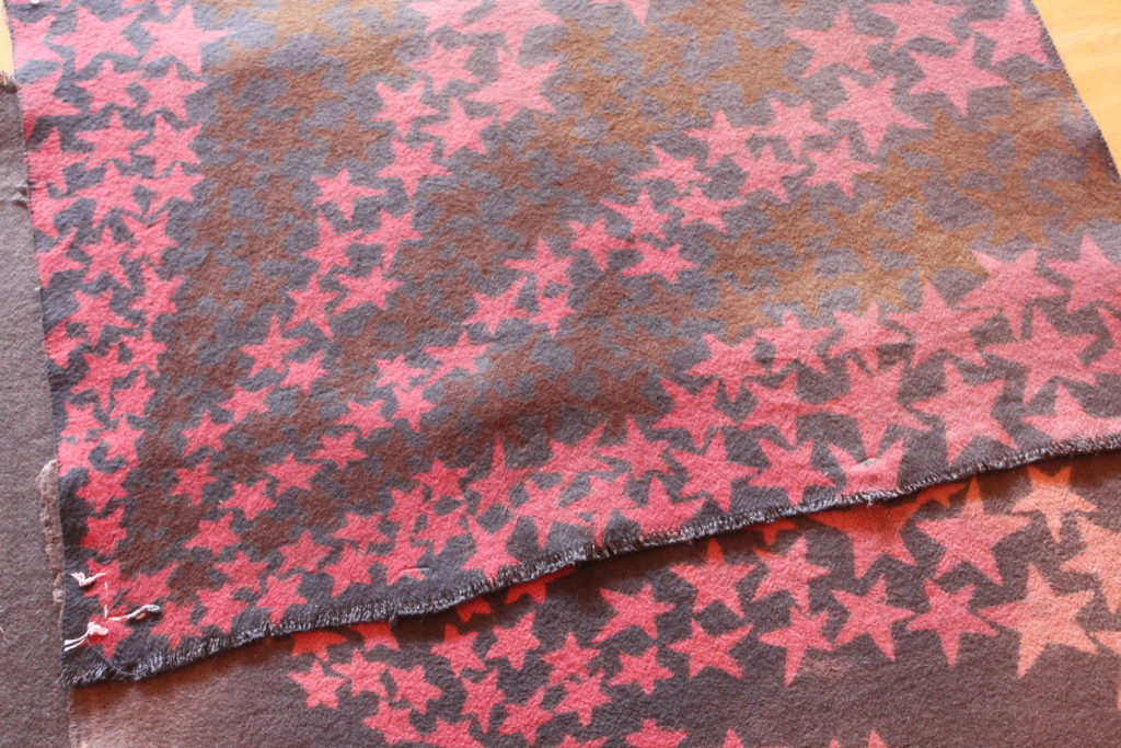 次に着抜技法で星の形を錫着抜とチタン着抜をして、色を変えています。。星の形は大小4種類、型紙をカットして作ったそうです。星の向きが同じ方向にならないよう気を付けたそうで、布の片方の角からの1枚と中心からの1枚、順に流れるようにきれいに並んでいますね。