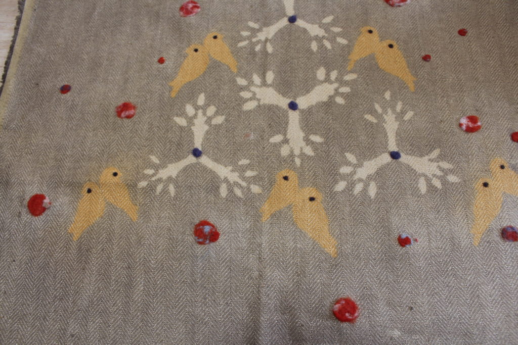 茜で染めたきれいな赤に藍やビワの色の原毛を混ぜあわせて、ちょっと複雑な色のドットがフェルトして散りばめられ、楽しいテキスタイルになりました。
